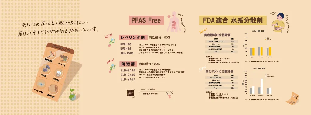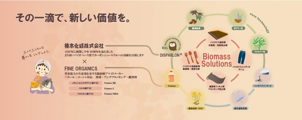 楠本化成は、ディスパロン(塗料インキ向け添加剤)の強みを生かし、産業界の明日を開く様々なテーマへの技術的アプローチすなわち、未来の価値ある技術革新に取り組んでいます。